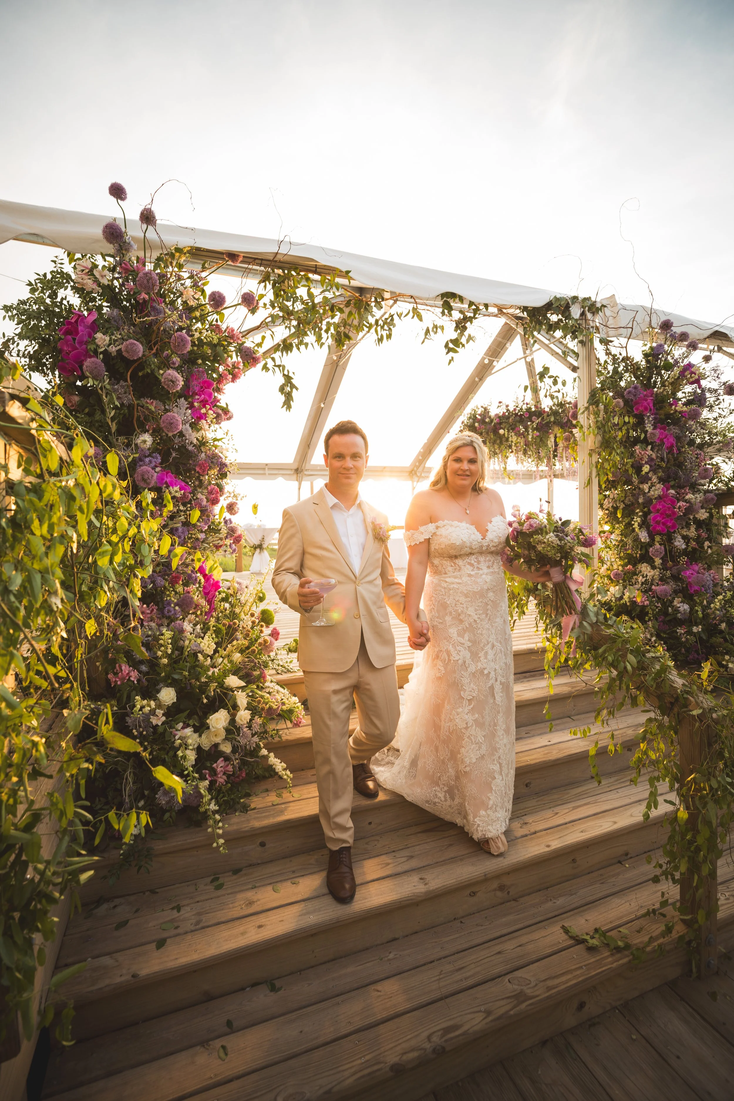 The day was adorned with stunning florals that added a vibrant touch to the already picturesque setting. As the sun dipped below the horizon, the sky lit up in a spectacular display, creating the perfect backdrop for their evening celebration. We couldn’t have asked for a more beautiful day or a more wonderful couple to work with—Summer & Warren are truly amazing, and we feel so lucky to have been part of their love story!